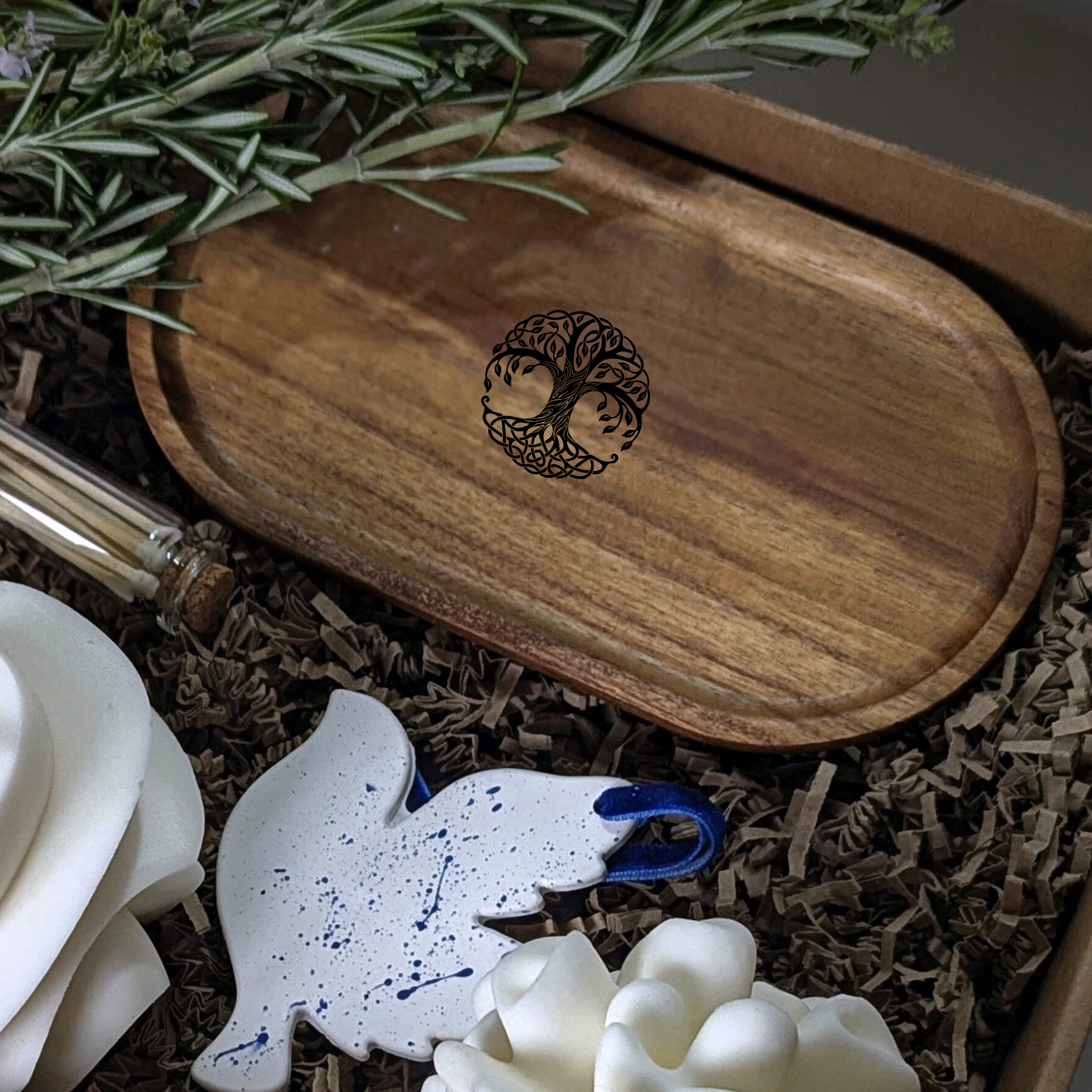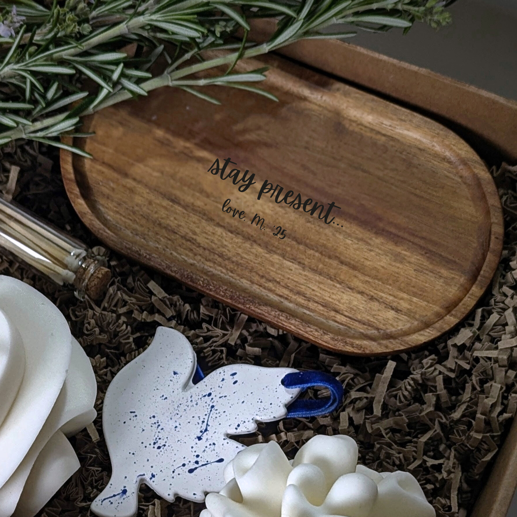 - 1 x wooden acacia oval coaster from locally-produced wood with handwritten fonts that can be customized with personalized messages.